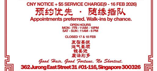 Please note that a Chinese New Year surcharge of $5 will apply to all services during the CNY period (9 Feb - 16 Feb).